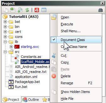 to our project’s tutorial01\src\ folder. In the Project Manager right click on Scaffold_Mobile.as and choose “Document class”: