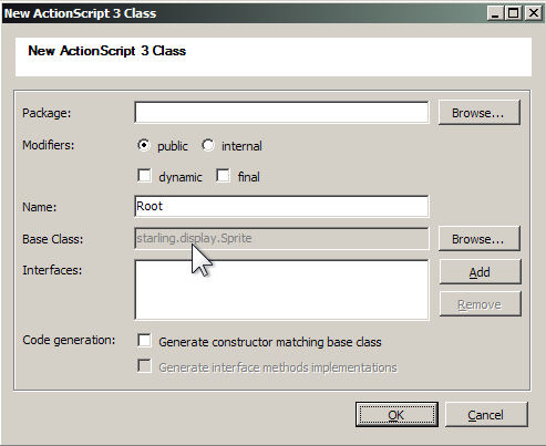 A new window will open up, name your new class “Root” and choose starling.display.sprite as Base class.