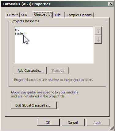 Lastly, let’s copy the whole “system” folder from the Starling Scaffold Mobile project (\samples\scaffold_mobile\system) to our project’s main directory. This folder contains some default images that the application will use by default backgrounds at the very beginning while everything else is loading. In order for this folder to be targeted correctly by the code in Scaffold_Mobile.as we need to tell FlashDevelop its classpath.