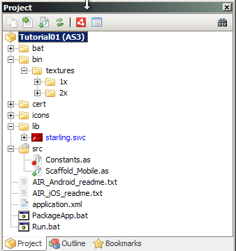 Go back to the Starling framework you downloaded earlier, navigate to the Starling Scaffold Mobile project (samples\scaffold_mobile\src\) and copy the following two files: